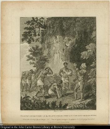 Sources: Carletta Denise, “March 14, 1975: Chief Joseph Chatoyer Is Killed,” Black Then: Discovering Our History, 3/16/2017. Retrieved 6/24/2019, https://blackthen.com/%E2%80%8Bmarch-14-1795-chief-joseph-chatoyer-is-killed/. “Garifuna: Africans in St. Vincent, Caribbean and Honduras, South America,” Black History Heroes. Retrieved 6/24/2019, http://www.blackhistoryheroes.com/2014/02/the-garifuna-pueblos-africans-in-st.html Engraving: Antonio Brunias (1730-1796) and Charles Grignion the Younger (1754-1804), 3/18/1796. Public Domain in U.S.: Pre 1/1/1925. Public Domain elsewhere where copyright term is author’s life plus 100 years or less.