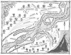 Sources: James P. Averill, Fort Meigs: A Condensed History (Toledo, Ohio: Slade Printing and Paper Co., 1886), pp. 7-30. Retrieved 6/29/2019, https://archive.org/stream/cihm_02206#page/n35/mode/2up “Dudley’s Defeat,” Ohio History Central. Retrieved 6/29/2019, http://www.ohiohistorycentral.org/w/Dudley%27s_Defeat Sketch: Benson J. Lossing, undated. From Lossing’s Pictorial Field Book of the War of 1812 (New York: Harper & Brothers, 1868), p. 488. Public Domain in U.S.: Pre 1/1/1925. Public Domain elsewhere where copyright term is author’s life plus 100 years or less.