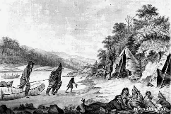 Source: Lucien Campeau, “Membertou,” Canadian Encyclopedia of Biography, 1966. Retrieved 7/4/2019, http://www.biographi.ca/en/bio/membertou_1E.html Engraving: Hibbert Binney (1766-1842), circa 1791. Mi’kmaq Encampment. Nova Scotia Museum. Public Domain in U.S.: Pre 1/1/1925. Public Domain elsewhere where copyright term is author’s life plus 100 years or less.