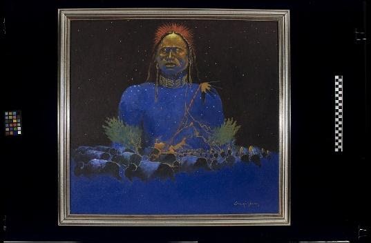 Source: Lars Krutak, “Treasures of The Iacb: Mirac Creepingbear, A-Ho (1981),” Indian Arts and Crafts Board, U.S. Department of the Interior, 6/8/2018. Retrieved 7/17/2019, https://www.doi.gov/iacb/treasures-iacb-mirac-creepingbear-ho-1981 Painting: Mirac Creepingbear [Kiowa/Chaticks Si Chaticks (Pawnee)/Southern Inunaina (Arapaho)] (1947-1990), circa 1987. “Answered Prayers.” Donated to the National Museum of the American Indian from the collection of R. E. Mansfield (Richard E. Mansfield), Non-Indian (1937-2007), in 2005. Courtesy of the National Museum of the American Indian, Smithsonian Institution (280666).