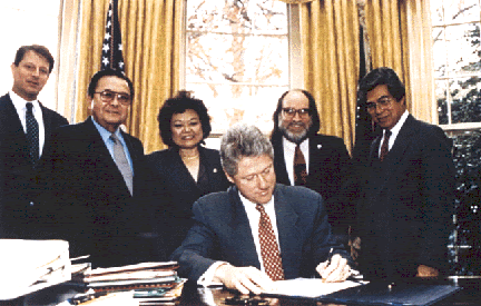 Sources: U.S. Public Law 103-150. Retrieved 7/21/2019, https://en.wikisource.org/wiki/Public_Law_103-150 Photo: Official White House signing photograph. Public Domain. Photograph taken by an officer or employee of the United States Government as part of that person’s official duties under the terms of Title 17, Chapter 1, Section 105 of the US Code