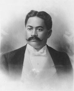 Born in Honolulu on the homestead of his aunt, Queen Kapiʻolani, David’s name meant “Fearless Prophecy.” He was the first child of High Chief David Kahalepouli Piʻikoi from Kauaʻi and Victoria Kūhiō Kinoiki Kekaulike–sister of Queen Kapiʻolani (consort to King Kalākaua) and later royal governor of the island of Hawaiʻi. David became Prince in 1883 and declared the 3rd heir (after princesses Liliʻuokalani and Kaʻiulani) to the throne. In 1885, while at a private military school in San Mateo, California, David and his brothers demonstrated the Hawaiian sport of board surfing. A member of Queen Liliʻuokalani’s Privy Council. he became a supporter of the Royalist resistance after the Hawaiian Kingdom was overthrown in 1893. Kawānanakoa was arrested for treason after the failed 1895 Counter-Revolution, but ultimately released. Subsequently, Kawānanakoa became a founder of the Democratic Party of Hawaii. He died of pneumonia on June 2, 1908 in San Francisco.