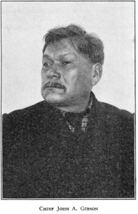 From Tuscarora Township, Six Nations Reserve, of an Onandoga father and Seneca mother, Gibson was a noted lacrosse player in the Brantford area, managing the United Six Nations Lacrosse Team, and was known for making lacrosse sticks. Embracing the Longhouse beliefs, he studied traditions and religion from an Onondaga elder. By 1872, Gibson held the hereditary title of Skanyátaí.yo? (“Handsome Lake”)-name of the Seneca prophet–on the Confederacy Council. Keeper of traditional names, he was authorized to preach the Gaiwiioh (Good Message) of Skanyátaí.yo?. He also worked with anthropologists to preserve Six Nations heritage. In 1899, he dictated the traditional structure of the Iroquois League and helped draft the Code of Dekanahwideh – in effect, the Iroquois Confederacy Constitution. Gibson died on the Reserve on November 1, 1912.