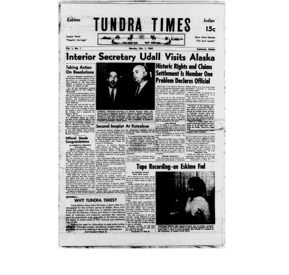 Sources: Robert M. Fox, “Guide to the Interview with Howard Rock,” Archives and Special Collections, at the UAA/APU Consortium Library, 1976. Retrieved 6/30/2020, https://archives.consortiumlibrary.org/collections/specialcollections/hmc-0210/ Elizabeth James, “Howard Rock and the Tundra Times,” LitSite Alaska. Retrieved 6/30/2020, http://www.litsitealaska.org/index.cfm?section=digital-archives&page=People-of-the-North&cat=Native-Lives-and-Traditions&viewpost=2&ContentId=3102 Photo: Tundra Times. Fair Use. Source: About Tundra times. [volume] (Fairbanks, Alaska) 1962-1997 « Chronicling America « Library of Congress (loc.gov).