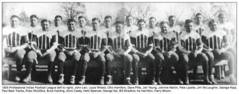 The Hominy Indians football team, established in the early 1920s, was comprised of members from several different tribes, including several Osage tribal members. The Hominy team played on a national level and was said to have been undefeated. It was this achievement that soon awarded them the opportunity to play against the NFL champion New York Giants. Three weeks after the 11-1-1 Giants claimed the NFL title, the team traveled to Pawhuska, Oklahoma, to face the Indians. According to the game’s accounts published in the Daily Journal-Capital, “The first score came in the first quarter when a fleet Indian end snatched a pass from the air after Hill for the Giants had fumbled, and raced 50 yards for a touchdown.” With the game tied at six, Arapaho All-American fullback John Levi took over at quarterback and tossed a 60-yard bomb for the winning score. Also on the Indians squad that day was eventual baseball Hall of Famer Johnny “Pepper” Martin.