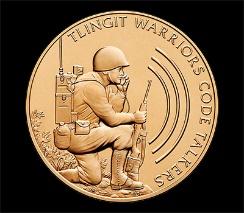 Source: “Alaska Legislature passes proclamation honoring Tlingit code talkers,” Sealaska, 3/6/2019. Retrieved 6/4/2021, HeritageNEWS_Alaska Legislature passes proclamation honoring Tlingit code talkers | Sealaska Heritage Medal: U.S Mint, 2008. Tlingit Code Talker Congressional Medal. Public Domain.