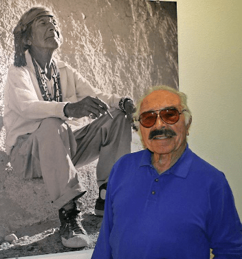 Photo: Tomcorbett, 6/18/2006. Photographer Lee Marmon stands next to an enlarged version of his most well-known image, "White Man's Moccasins" (1954) at the Indian Pueblo Cultural Center in Albuquerque, New Mexico (February 2006). Permissive Use.