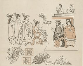 Drawing: Author unknown, circa 1550. Tenochtitlan, Entrance of Hernan Cortes. Cortez and La Malinche meet Moctezuma II. November 8, 1519. Public Domain.