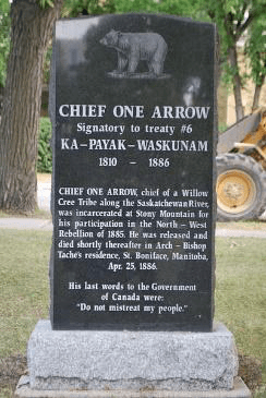 Born circa 1815 near the Saskatchewan (SK) River, One Arrow led a band of Willow Crees. By 1879, the band settled near the Métis settlement of Batoche, SK. In 1885, during the North-West rebellion, he was present at a meeting where Indian Agent John Lash was taken prisoner by Métis leader Louis Riel. His men were seen armed and in the company of the Métis immediately following the battle at Duck Lake in March 1885. One Arrow, who was likely too old to have taken part, was arrested on a charge of treason-felony, and tried at Regina on August 13, 1885. His lawyer, unable to gain One Arrow’s confidence, could not present a coherent defense. One Arrow denied active participation, claiming that he was coerced by Métis leader Gabriel Dumont into joining the rebels. Convicted, he was sentenced to 3 years imprisonment where his health rapidly deteriorated. Released April 10, 1886, he was carried to the home of the Catholic archbishop of St Boniface, MB, where he died on Easter Sunday, 25 April 1886.