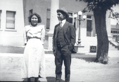 Photo: Author Unknown, 3/21/1916. Photograph of Nettie Odelty and Parker McKenzie in front of the Administration Building at the Phoenix Indian School, March 1916. Permissive Use.
