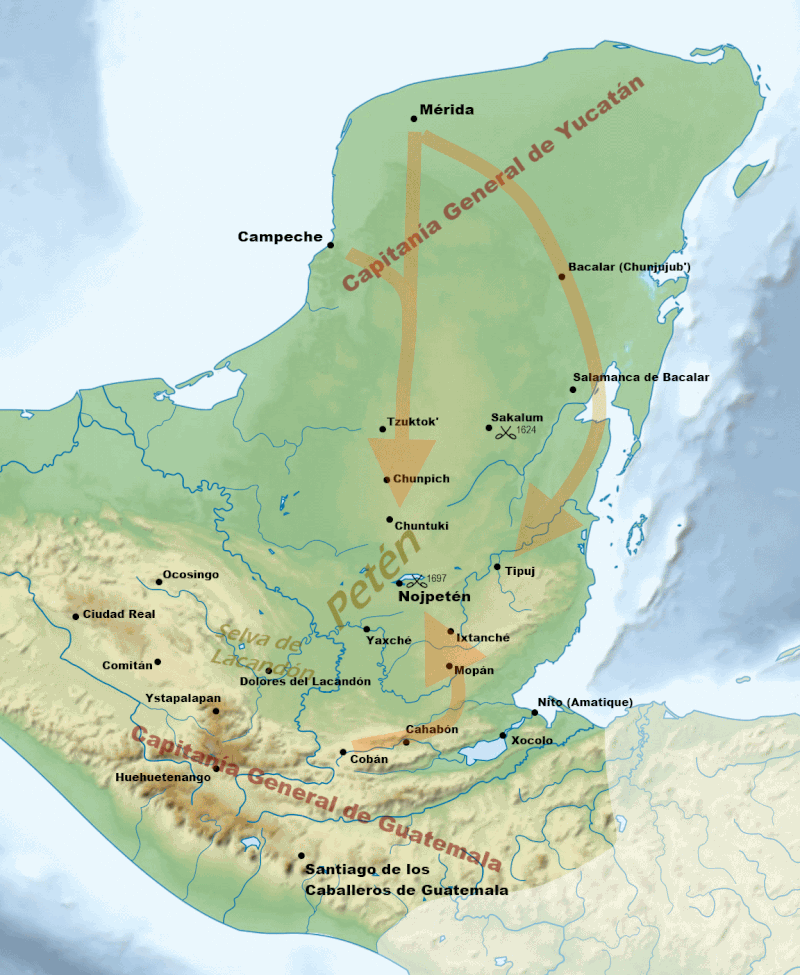 Map: Semhur, 8/9/2011. Maya civilization cultural area map. Retouched: Simon Burchell, 4/26/2013. Routes of approach by the Spanish against the fiercely independent Itza and their neighbors during the 17th century. Permissive Use.