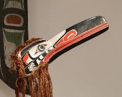 Source: Gerald R. McMaster, “Mungo Martin,” Canadian Encyclopedia, 10/1/2017. Retrieved 2/9/2022, Mungo Martin | The Canadian Encyclopedia Photo: Difference Engine, 9/12/2018. Gwaxwiwe' hamsiwe' (mask of the raven man-eater). Mungo Martin (Nakapankam), Kwakwaka'wakw, ca. 1940. Red cedar, red cedar bark, paint. Permissive Use.